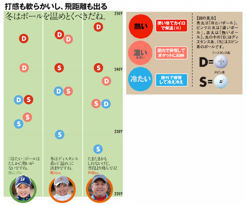 「ディスタンス系」と「スピン系」のタイプの違うボールを、3つの温度で検証。①前日から屋外保管してあった“冷えた”ボール②前日から屋内保管し、打つまでポケットに収納した“ぬるい”ボール③前日から屋内保管し、使い捨てカイロで2時間温めた“熱い”ボール。