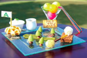 プレー後は、インスタ映えするデザート『運命の3番ホール』を楽しんで頂きたい。名物ホールの西3番をデザートにモチーフし、ティグランドからグリーンまで、すべて食べられる。レストランはカフェスタイルで営業、女性の人気メニューは『ひたち鶏のグリルセレクション』ソースは〈ピリ辛トマト〉〈ハニーマスタード〉〈ガーリックオニオン〉の3種類から選べる。