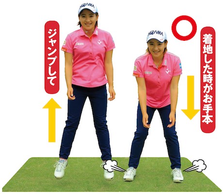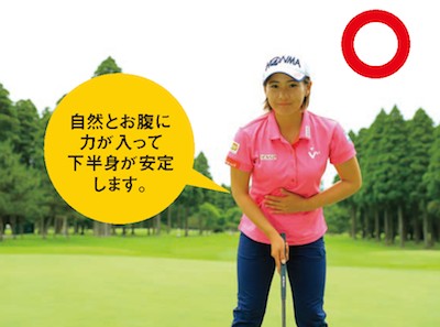 フェースの向きが安定するストロークを行うポイントは両足でしっかりと地面をつかみ、さらに腹圧を上げて体幹に力を入れ、腰から下をどっしりとさせて、ストローク中に下半身が動かないようにすることです。