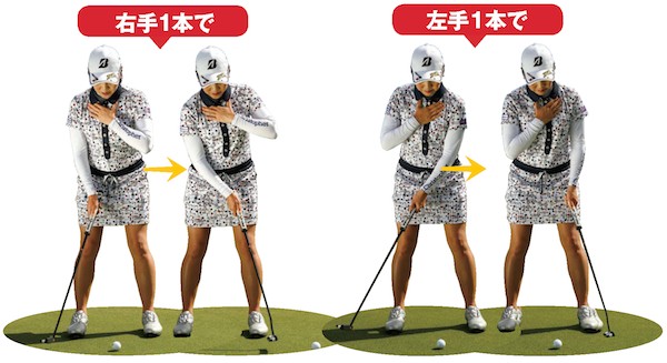 これを繰り返すことで、手や腕のムダな動きを抑えた、肩主体のストロークが身に付きます。月イチレベルのアマチュアゴルファーの多くは、インパクトで手首が動く、手首をコネる傾向があります。