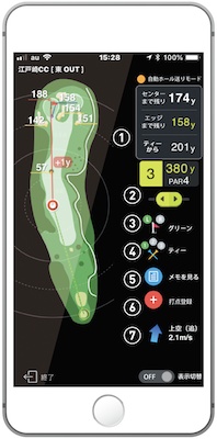 また余分な装飾や機能をそぎ落としたシンプルなレイアウトであり、距離測定がしやすいこともこのゴルフアプリの魅力。もちろんハザード距離のワンタッチ表示やホールの自動切り替え、風向きメーターなど、必要な機能は十分に備えています。