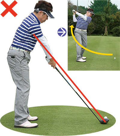 腕とクラブの角度がなく、体から腕が離れると手打ちになって再現性の低いスイングに……。極端なヨコ振りになりやすく、パワーも逃げて飛ばなくなってしまう。