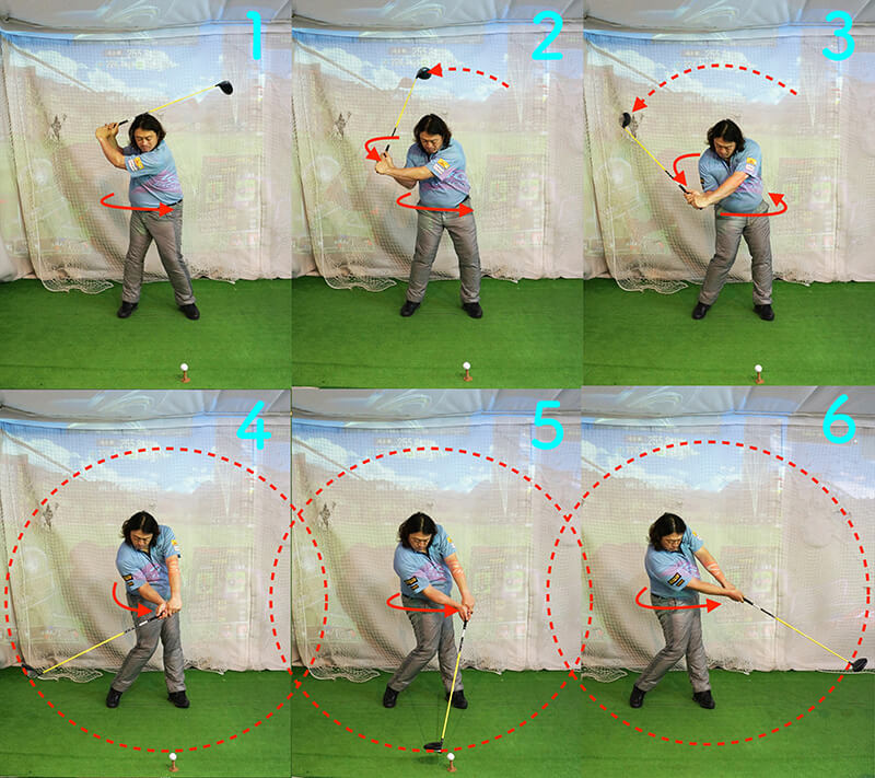 体が腕やドライバーを引っ張り回し、スイングを行う順番はバックスイングもダウンスイングも同様に、体幹、腕、グリップ、シャフト、ヘッドの順番で自分の体を中心に円が回っているイメージで練習をしてください。体を回すイメージがわかりにくい時は、首の周りを肩が旋回するイメージでも構いません。