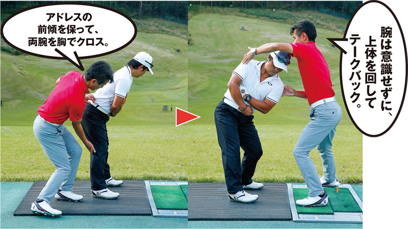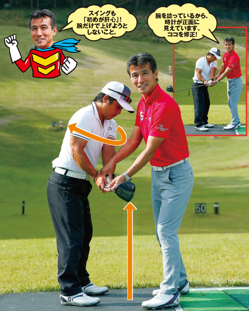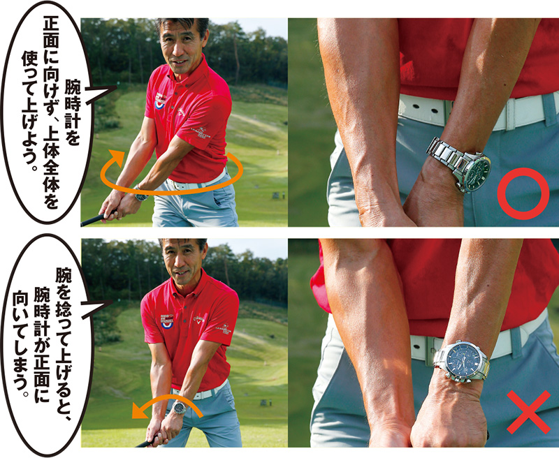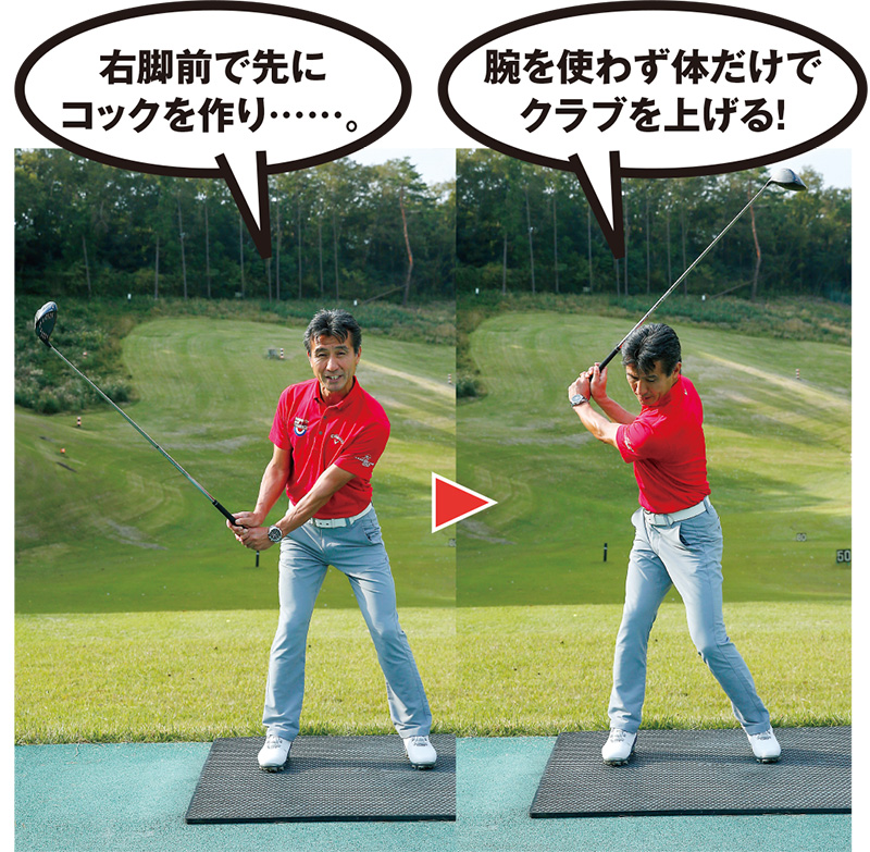 テークバックが「手上げ」になってしまう人は、右脚前で先にコックした状態を作り、左肩を入れるようにして上体でテークバックしてトップまで上げる。これを繰り返してコツをつかもう!