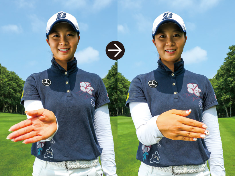 ハンドファーストにするのは、基本ですが、その中でハンドファーストにする時の手首の動かし方がポイントです。私は右手首を支点にして、甲側に折るようにして構えます。