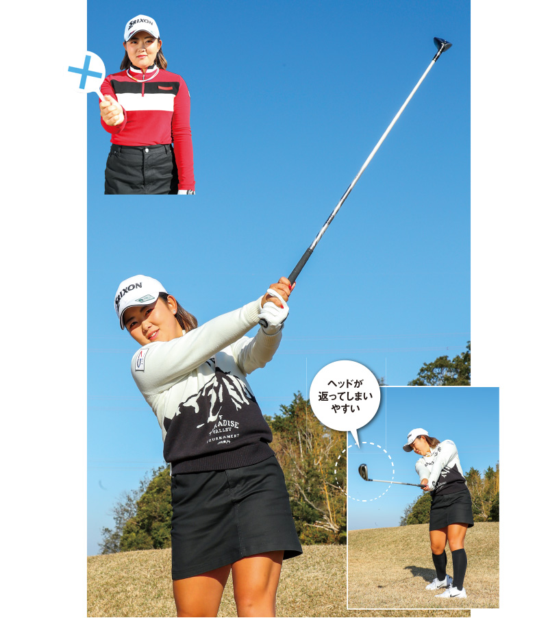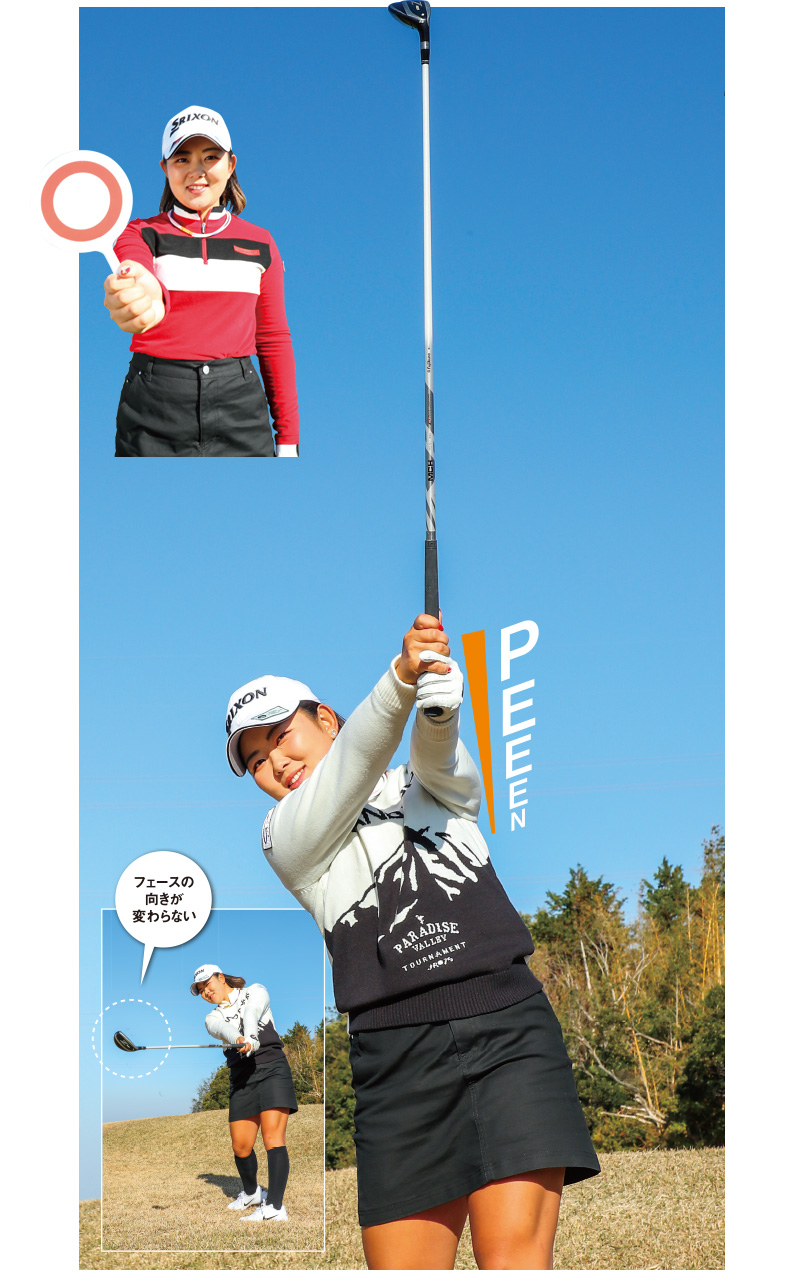 そして、1番大事なのはそのフェースの向きをフォローでもキープし続けること。そのために私はフォローで両ヒジをピーンと真っすぐ伸ばした状態で、クラブを振り抜きます。