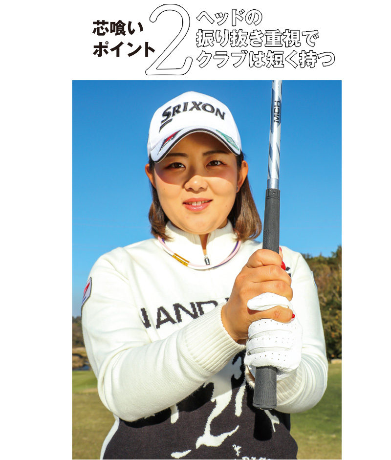 クラブを短く持つのは、ヘッドの抜けをより良くすることが目的。ラフだとヘッドが芝に絡みやすくなるので、少しでも短く持って振り抜きやすくしています。