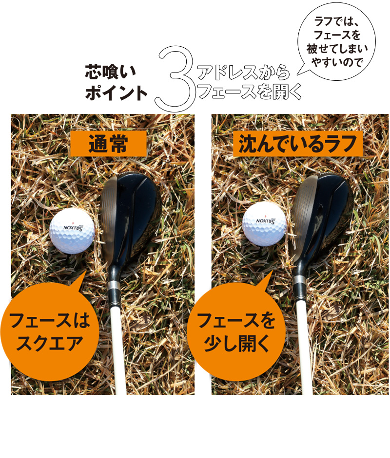 ラフでは、フェースを被せてしまいやすいのでアドレスからフェースを開く