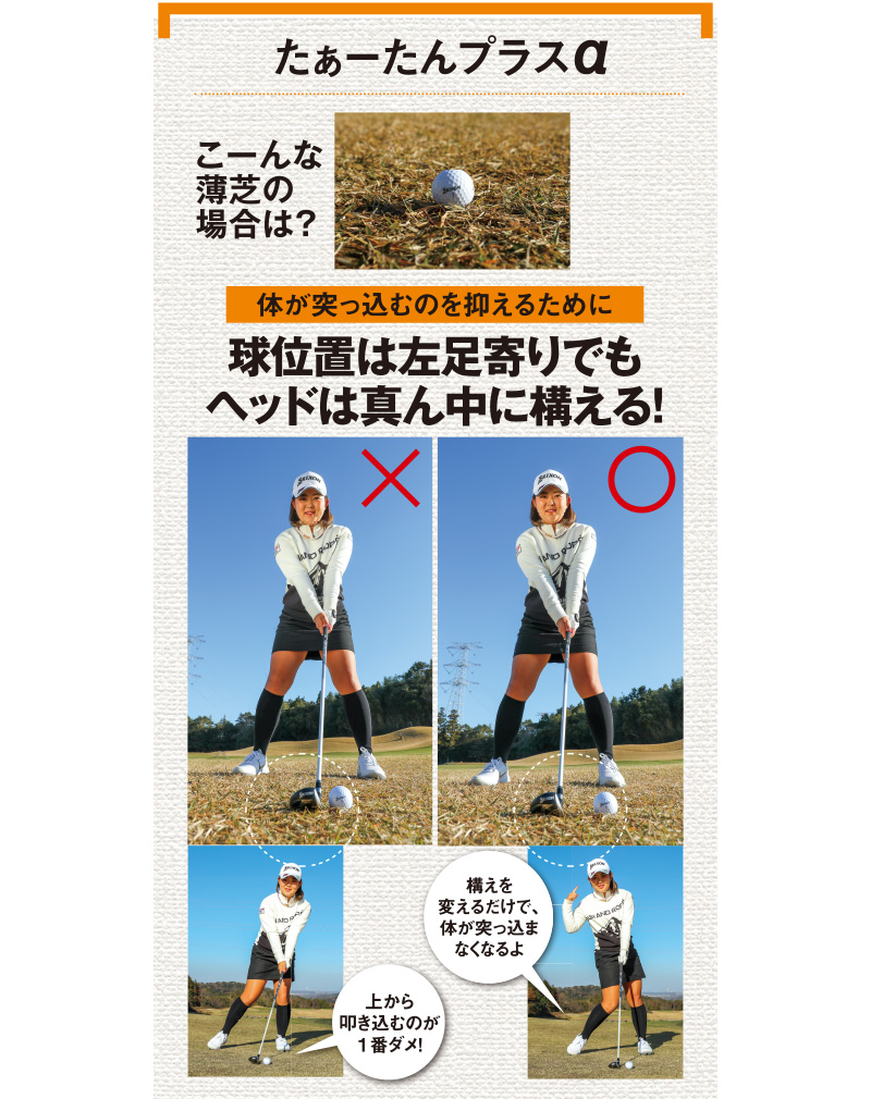 芝が薄い場合は、ヘッドの入れ方に注意します。体が突っ込むのは、球が左足寄りにあるので、インパクトでヘッドが届かないと思い体が突っ込んでしまうのが原因です。