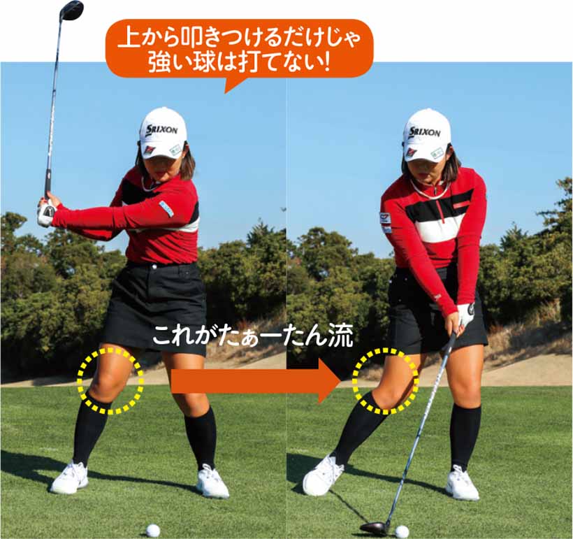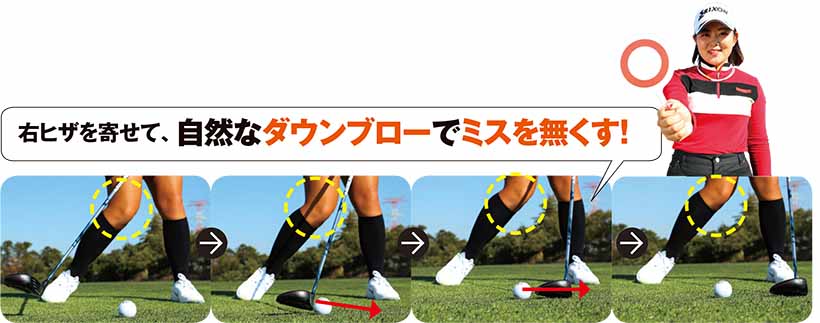 右ヒザを左ヒザに寄せてダウンスイングすることで、右肩が下がらなくなり上半身の軸をキープしたまま自然なダウンブローでインパクトすることができる。