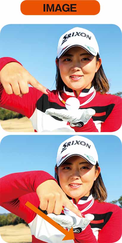私も、低くて強い球を打ちたいときにはもちろんダウンブローの意識があります。私のイメージは球の真ん中を赤道として、赤道から南半球を「えぐる」ようにインパクトすること。そのためには上から叩かないことが条件です。そこで私はトップからダウンスイングと同時に右ヒザを左ヒザに寄せるだけのイメージを持ち、上半身の突っ込みを防いでいます。そうすることで右肩が下がらなくなり、球の赤道からインパクトすることができます。