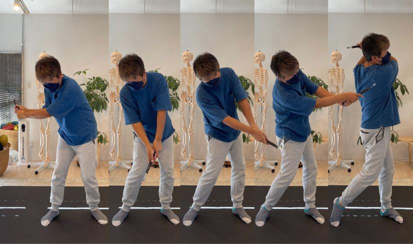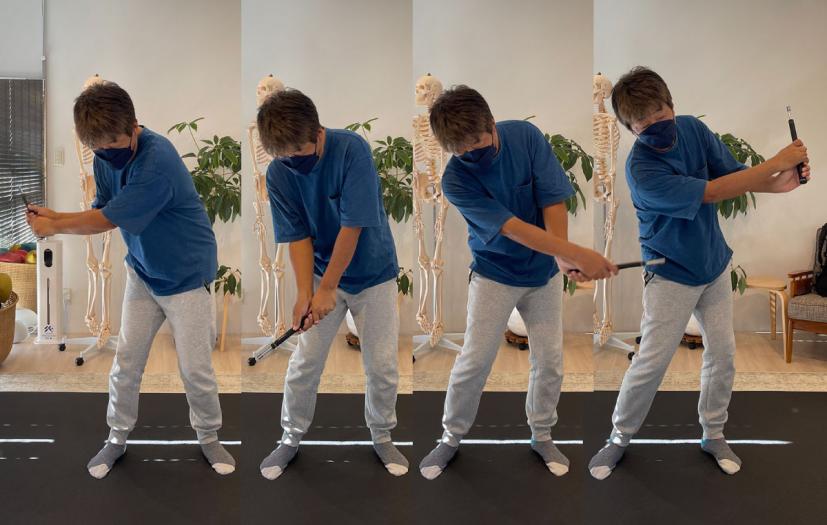 山本 では、今回もいつものように短いグリップを持ってスイングをしてみてください。仙骨から動き出してくださいね~。