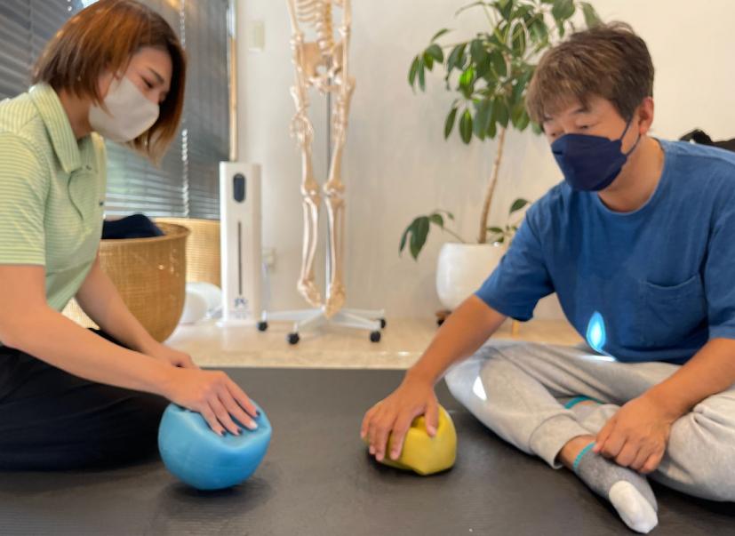 山本 この空気を抜いたボールの上に手を置いて、完全に手のひらの力を抜いてボールの上で手をゆらゆらと動かしてみてください。
