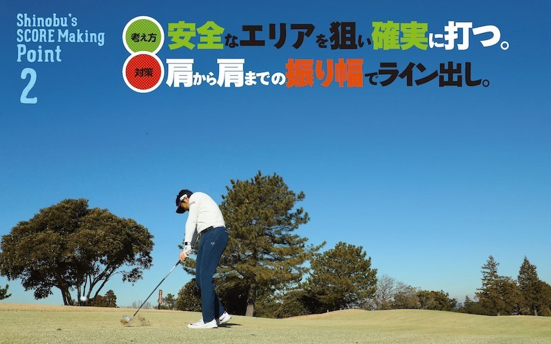 確実に安全なエリアへ打つ基本的な打ち方はハーフショットです。ただ、振り幅を半分にすると言う意味ではなく、体の動きをコンパクトにすると言うこと。だから肩をしっかり回転させて、インパクトでユルまないように。グリップを短く持つだけでも、スイング自体をコンパクトにすることができます。