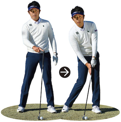 ワキが締まった状態で、背中に張りを感じるアドレスを作る。体の大きな筋肉を使うから反復性が高まる。