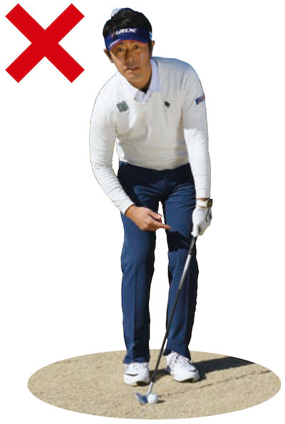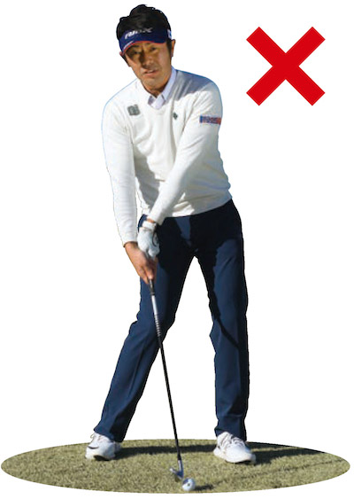 ワキがユルい状態のアドレスは見た目にも不安定。手先でストロークしやすくなり、当然精度も悪くなる。
