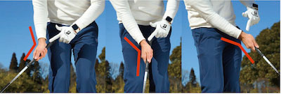 インパクトをゾーンにするためにポイントは右手首のキープ。アドレスからフィニッシュまで形は変えない。