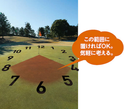 ピンに対して4時から8時のエリアにボールを止めると1パットの確率が高まる。