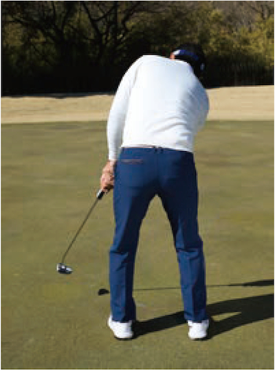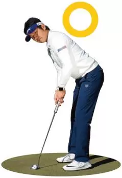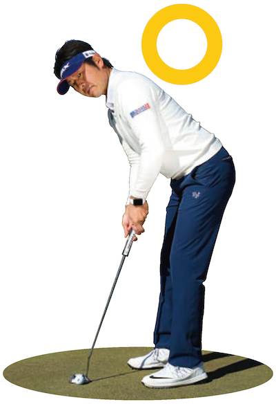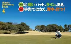 ラインを読んでイメージができたらあとはストローク。カップが近いとインパクトで合わせる動きが入りがちですが、手先を使わずしっかり肩の動きを使いましょう。このとき肩をタテに動かすことで、ヘッドがストレートに動いてくれます。ボールを長く押せるので、ラインに打ち出しやすくなります。