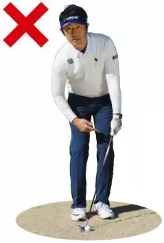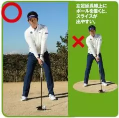 (右図)ボール位置が左足側に寄りすぎると、体が突っ込んだり、あおり打ちの原因になるのでオススメできない。