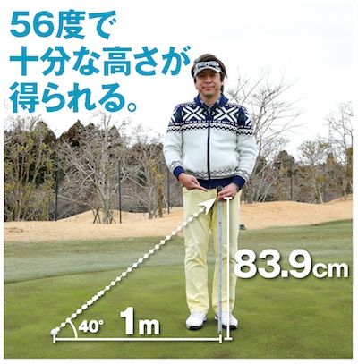 ウェッジでの球の打ち出し角はロフトの7割程度になる。56度のウェッジで40度程度なので、1m先で約84㎝の高さが得られる。