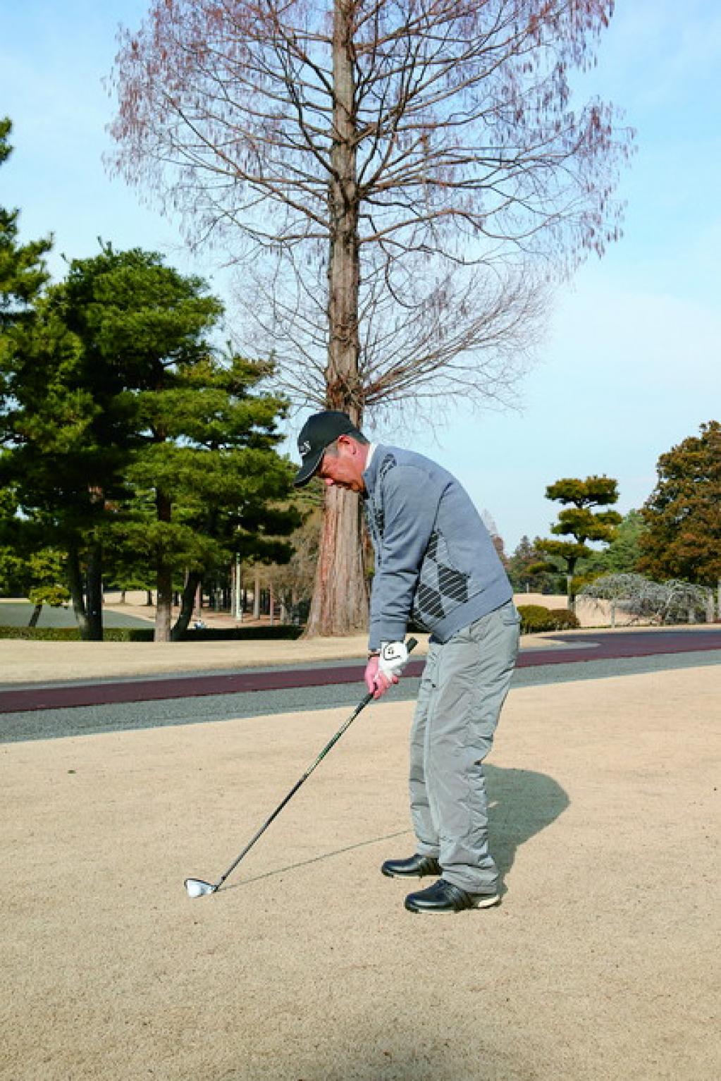 「ティアップして、6番アイアンでしっかり芯に当てる練習をしています。上下運動が入ると芯に当たらないので、股関節からきちんと曲げて立つのがポイントです。ヒザだけを曲げると上下に動きやすくなります」
