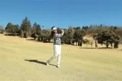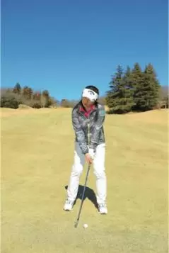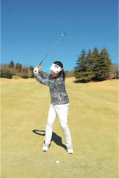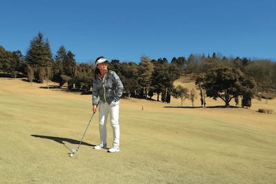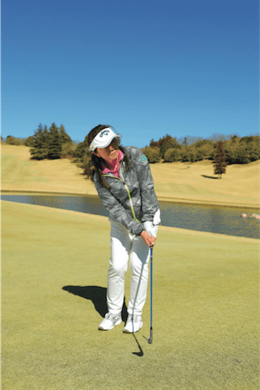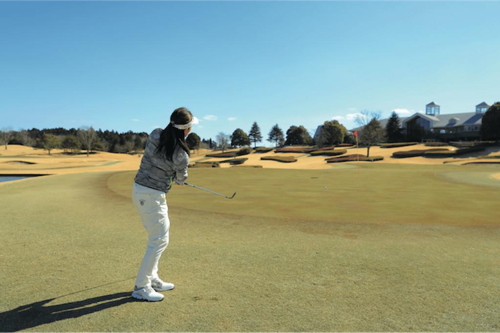 グリーンに向かって球筋をイメージしたら、素振りで疑似体験する。