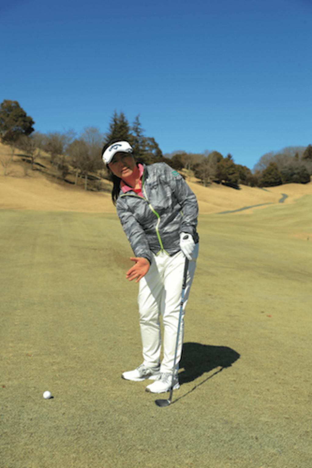 アマチュアにもわかりやすい片山の距離感出し。アンダースローでボールを投げる感覚を体に残しておく。