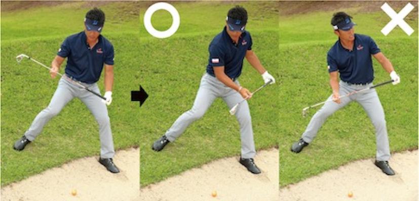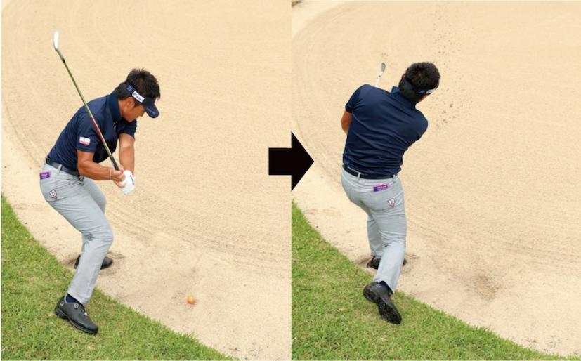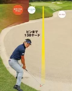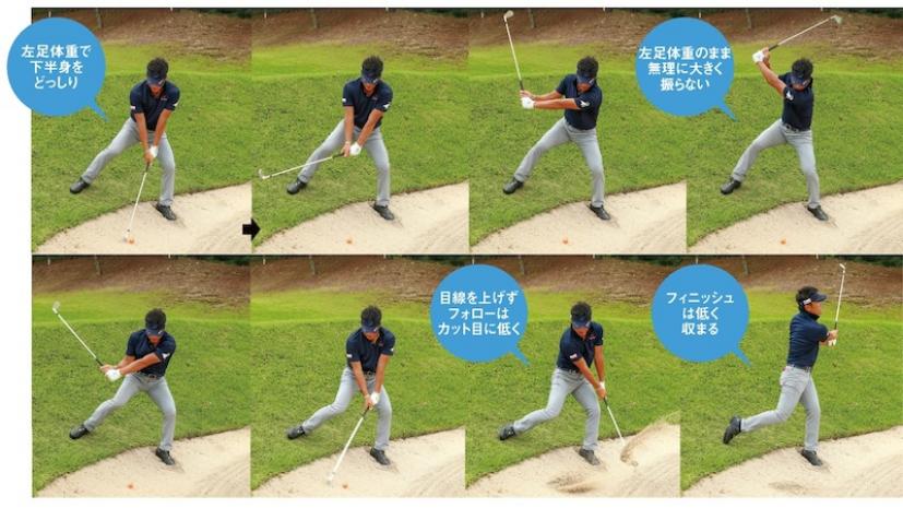 絶対ダフれない状況。薪割りっぽくヘッドを上から入れ、砂を薄くとりながら、フォローではその場でカットに振るイメージ。