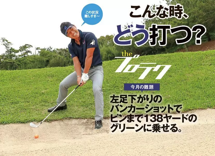 バンカーショットの中でも1、2を争う難しい状況です。条件的にいいのはボールのライだけで、あとはいいとこなし。左足下がりなので距離感が出しづらく、ボールも上がらない。ちょっとでもダフったら飛ばないし、最悪バンカーから出ないことも大いに考えられる。多少のトップなら出るとは思いますが、グリーンに乗せるつもりでトップすると飛びすぎて奥に外れる可能性まであります。
