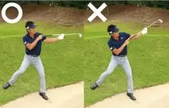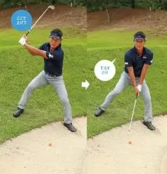アドレス時の左足体重をキープしたまま、その場でクラブを振り上げ、アドレスの位置にヘッドを戻すイメージでスイング。ダフりは絶対ダメなので、ダウンブロー気味にクラブを上から入れて砂を薄くとる感じです。