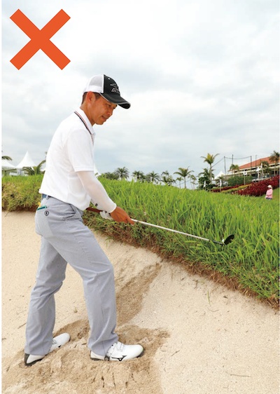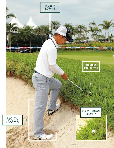 ピンが近いこともあって、ここから寄せるのはかなり難しいです。ラフの抵抗があるため、そこそこ大きく振らなければならないこと、ボールが上がって距離感がつかみづらいこと、さらに左に飛びやすいことなどがその理由です。また、スタンスもきつい左足上がりで、しかもバンカーの中ですから、バランスを崩さず打つことも重要になります。
