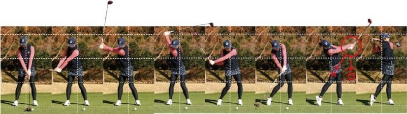 印象的なのは、いい意味でアドレスにリキ感がないということ。さあ、スタート!っていうと力が全身にグッと入るタイプですね。全体の回転で打っています。トップの位置までバランスのいい流れをしています。インパクト時の右手首の形、逆くの字 は○。いろんな意味でボールコントロールができる右手首だと言えます。