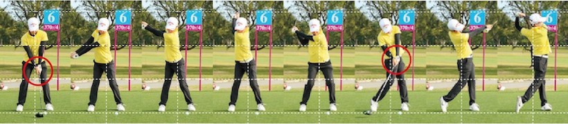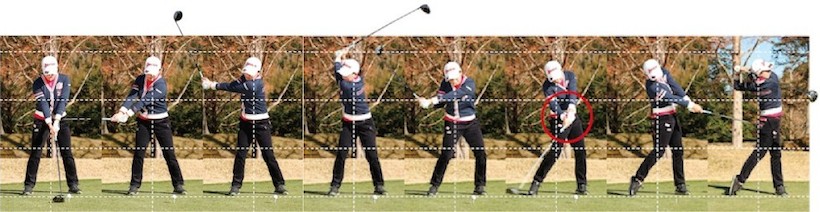 最近の選手には非常に少ないのですが、インパクト直前のクラブヘッドの位置に注目!この位置、この角度でまだインパクトを迎えていないというのが、飛ばせる要素であり、秘訣です。