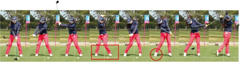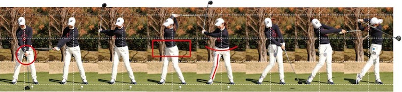 きれいに下半身を使っていますね。上半身のヒネリをすごく感じられる下半身です。少しリキみを感じる部分があるけど、もう3センチでいいから右ヒザが早く入ってくるといいかな。もっと美しいスイングになるでしょう。