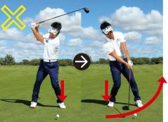 すくい打って球の上っ面を叩きトップやチョロが出るのは、トップで左足、インパクトで右足に体重が乗る「ギッタンバッコン打ち」が主な原因。これを防ぐには左足ヒールアップで体重移動を促し、確実にトップで右足に乗ることが不可欠。これさえできれば体を水平回転するだけで理想的なダウンスイング軌道が生まれ、持てる力を余すところなく伝えられるはずです。