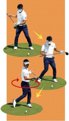 トップで右足に体重が乗れば上体が傾くことなく軸が保たれるから、体を水平回転させるだけでスムーズな振り切りが可能に。