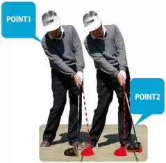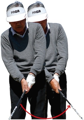 1.手の力が抜けると手首のスナップでヘッドが走り、インパクトで手を追い越す動きになる。