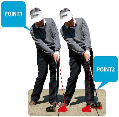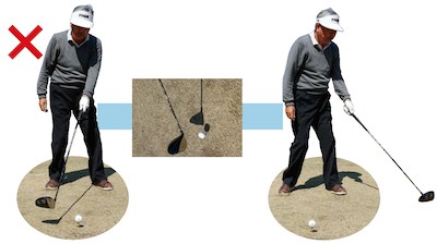 飛球線方向に出したヘッドをそのままアドレスの位置に戻すとヘッドがボールよりも遠くなる。つまり本来の軌道よりも外に振っているということ。
