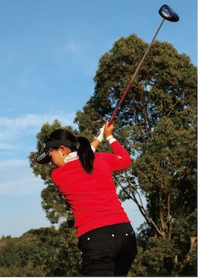 そこで私がいつも気をつけているのが、フォローでアゴに右肩がつくまで顔を上げないでガマンすること。こうすることで腕とヘッドが体にジャマされることなく走るので、ヘッドスピードが上がって飛距離も出るのです。