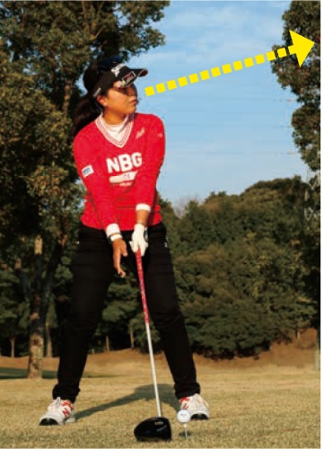 飛ばしたいなら、弾道を高くすることが重要。アドレスで注意することは、その高めの弾道をいかにイメージできるか。私 たちプロはどんな球でも打ちたい弾道をイメージすることを欠かしません。