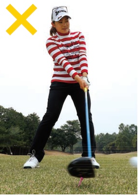 飛距離の出ないテンプラ気味のスライスは、体が突っ込むことで起こる。これは、フォローの予行練習を2回してから打つことで直しましょう。