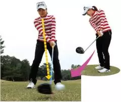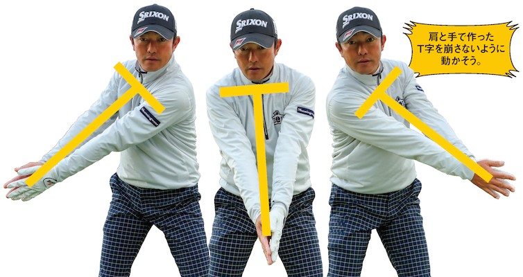 飛距離を出したいときに、右に乗ってから左に大きく体重を移して振り下ろすというスイングをすると、体が流れてしまい振り遅れてスライスになることが多い。そこで、アドレスで作った、肩のラインと腕で形成されたT字を崩さないように振ろう。