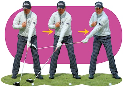 スタートが大事。胸を支点に左手とクラブは一直線のまま上げるようにすれば、手は体の前から外れない。