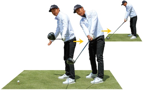 まず左足を踏み込み、これきっかけにクラブを下ろす感覚が肝。