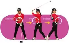 体が開いてしまう原因は、手を目標方向に早く振りすぎていること。これをなくして飛ばしたいというときは、素振りのトップで顔を飛球線後方に向けて振ります。