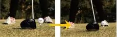 ▲(左)通常は、左足カカト前に球を置くのが安定する。(右)飛ばしたいときには、左足ツマ先の前まで球位置を変えて、ティは1センチほど高くする。