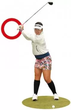 おヘソ周りに軽く力を入れる と、下半身がドッシリと安定します。よけいな力は入れずに、下半身をブレさせないことを意識することで、自然といつものスイング軌道で、よりスピード感のあるスイングができます。