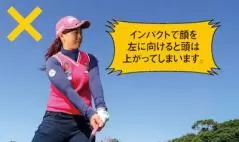 私がいつもミスショットだなって思う時は、だいたいが顔が早く上がってしまっています。結果が気になってしまい、インパクトと同時に顔を上げてしまうんです。そうするとせっかくダウンで体が開かなかったのに、顔が上がって右肩が出るので、手が先行したスイングになりヘッドは走らなくなってしまいます。
