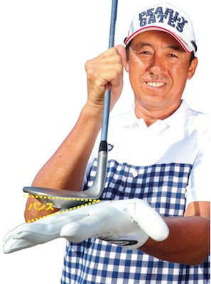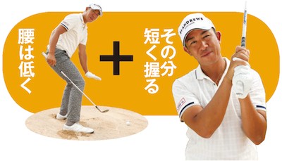 低いぶんクラブを短く握ったら、ヒザの角度と頭の位置を保って振り抜けばOK。上体が突っ込むとクラブが上から入りやすくなるので注意しましょう。